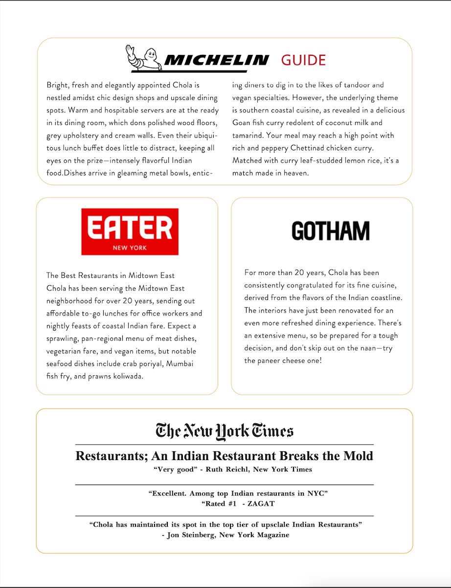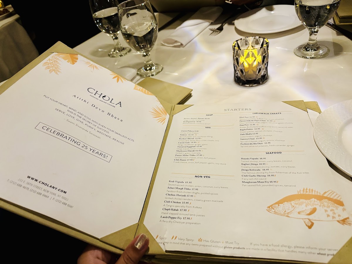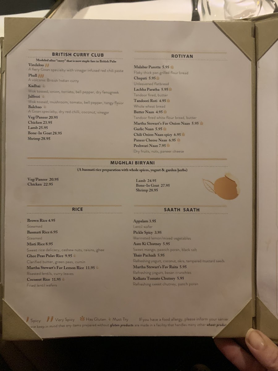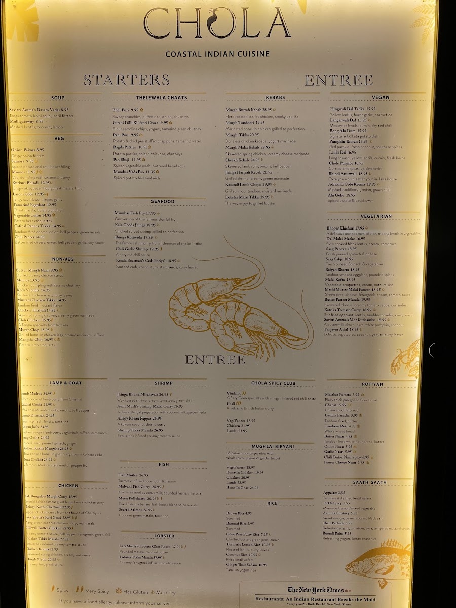 The menu at Chola offers a thoughtfully curated selection that reflects the rich coastal flavors of Indian cuisine, blending both familiar and distinctive dishes. Whether you’re settling in for a relaxed dinner or sharing small plates with friends, the menu provides a balanced mix of hearty entrées, vibrant vegetarian options, and satisfying sides. Highlights like the Dak Bungalow Murgh Curry, Tandoori Chicken, and Lamb Biryani invite a comforting warmth perfect for evening meals, while lighter bites such as Pani Puri and Tamarind Chutney offer a playful start to the experience.